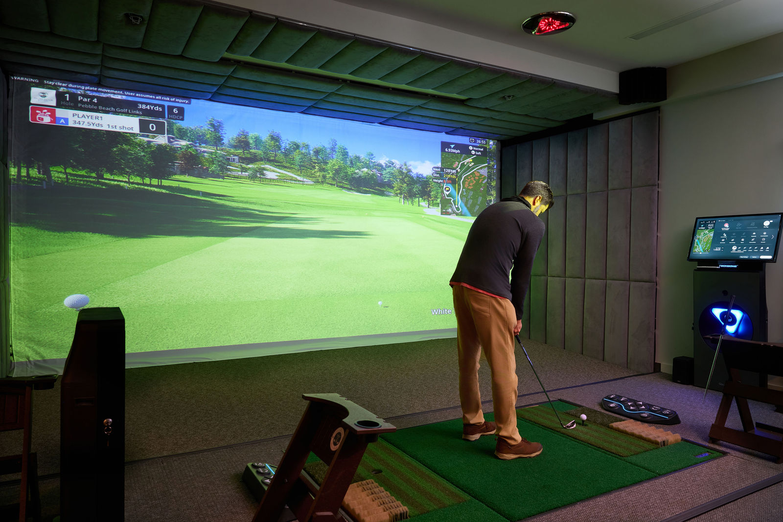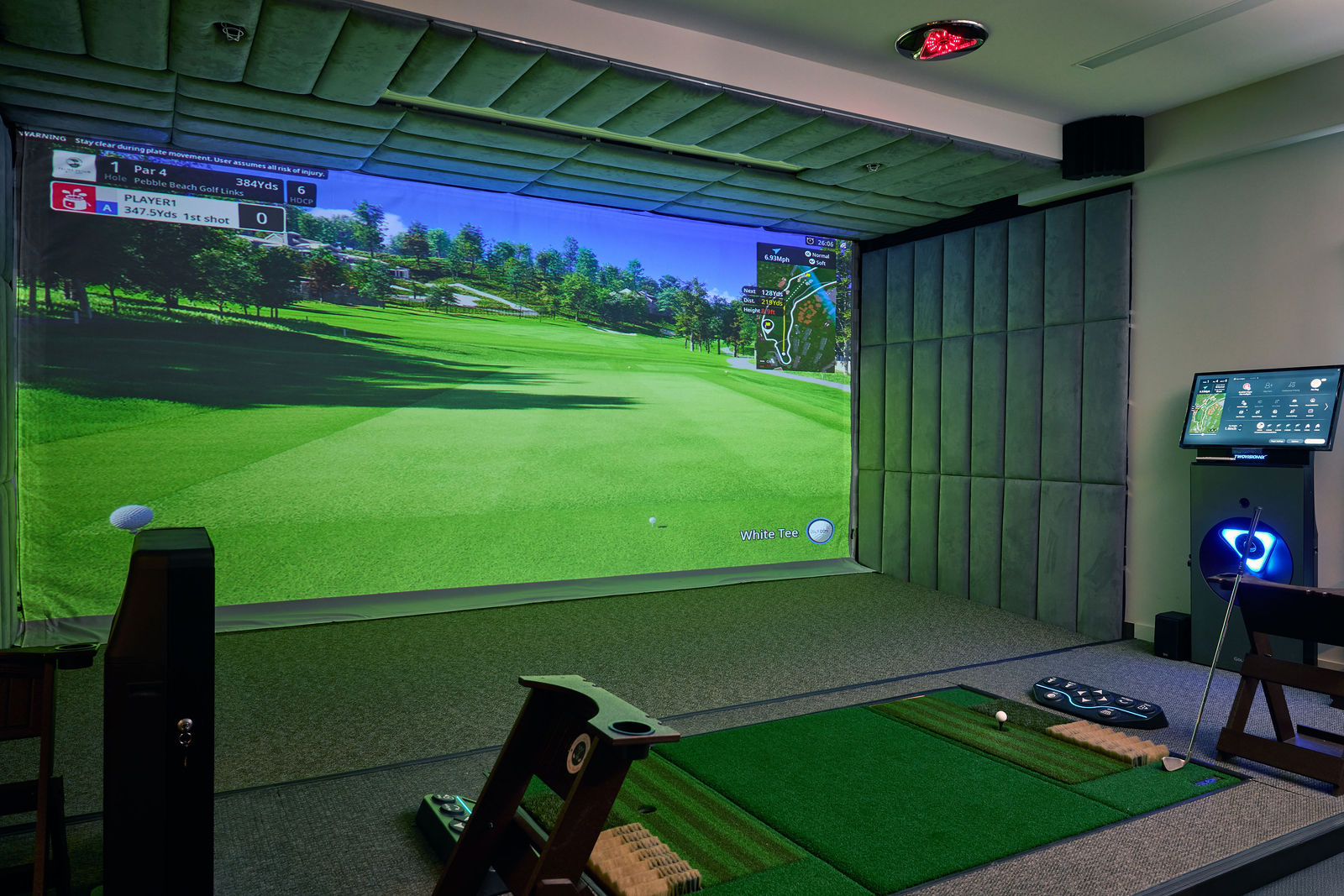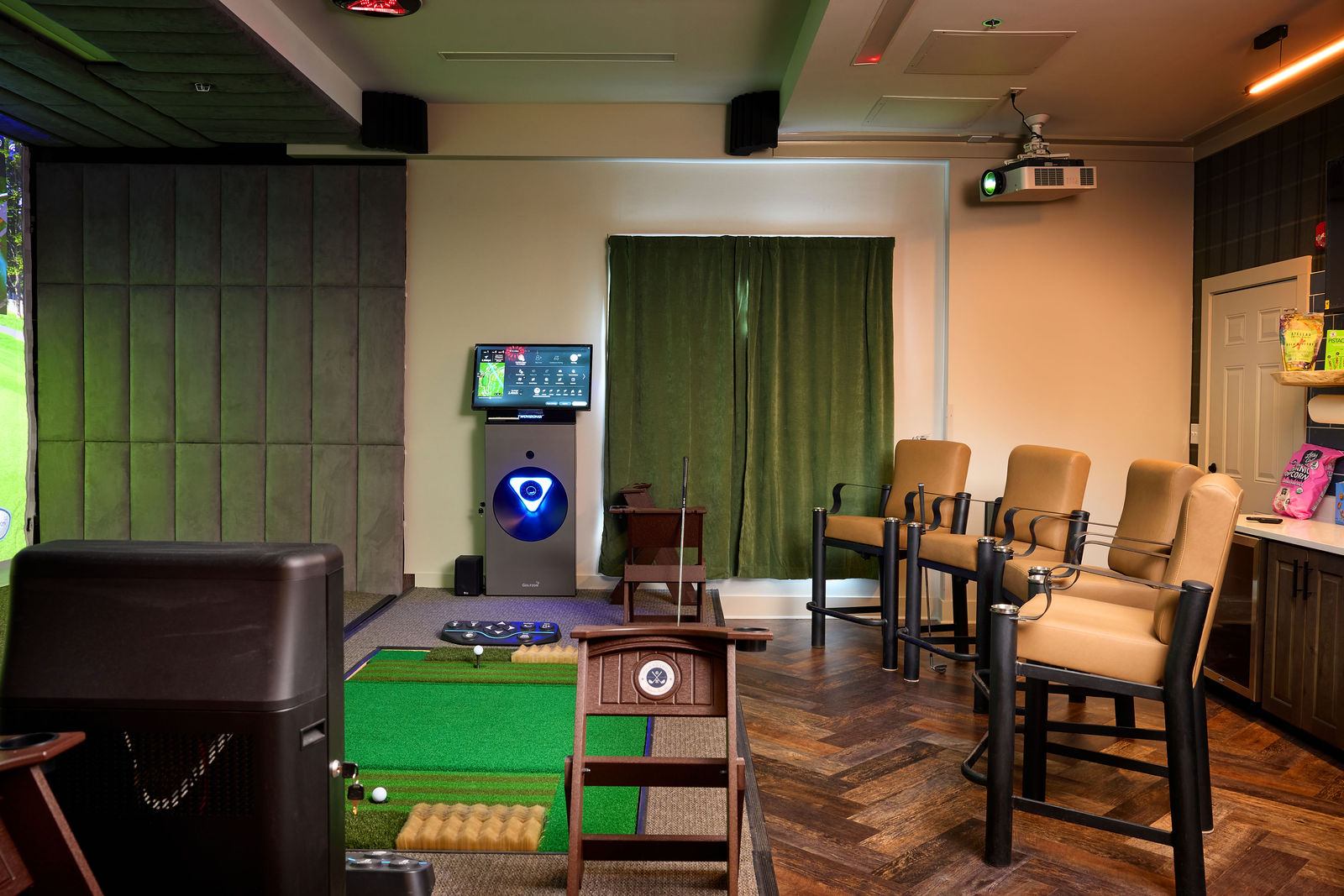 The Golfzon TwoVision NX is the latest and most advanced virtual golf technology offering the closest experience to being on a golf course offered in a simulator. Imagine your ball being automatically collected and teed up for you as opposed to chasing balls and bending over placing your own ball as with other simulators. You can work on your game in the comfort of our space when outdoor golf is either unavailable or uncomfortable due to weather. The Golf Retreat strives to deliver the best in golf technology while providing a comfortable lounge space complete with two self-serve wet bars, two fridges, and a comfortable Player's Lounge equipped with a 75" smart tv to have the game on. It is also a great space to have a meeting with clients.